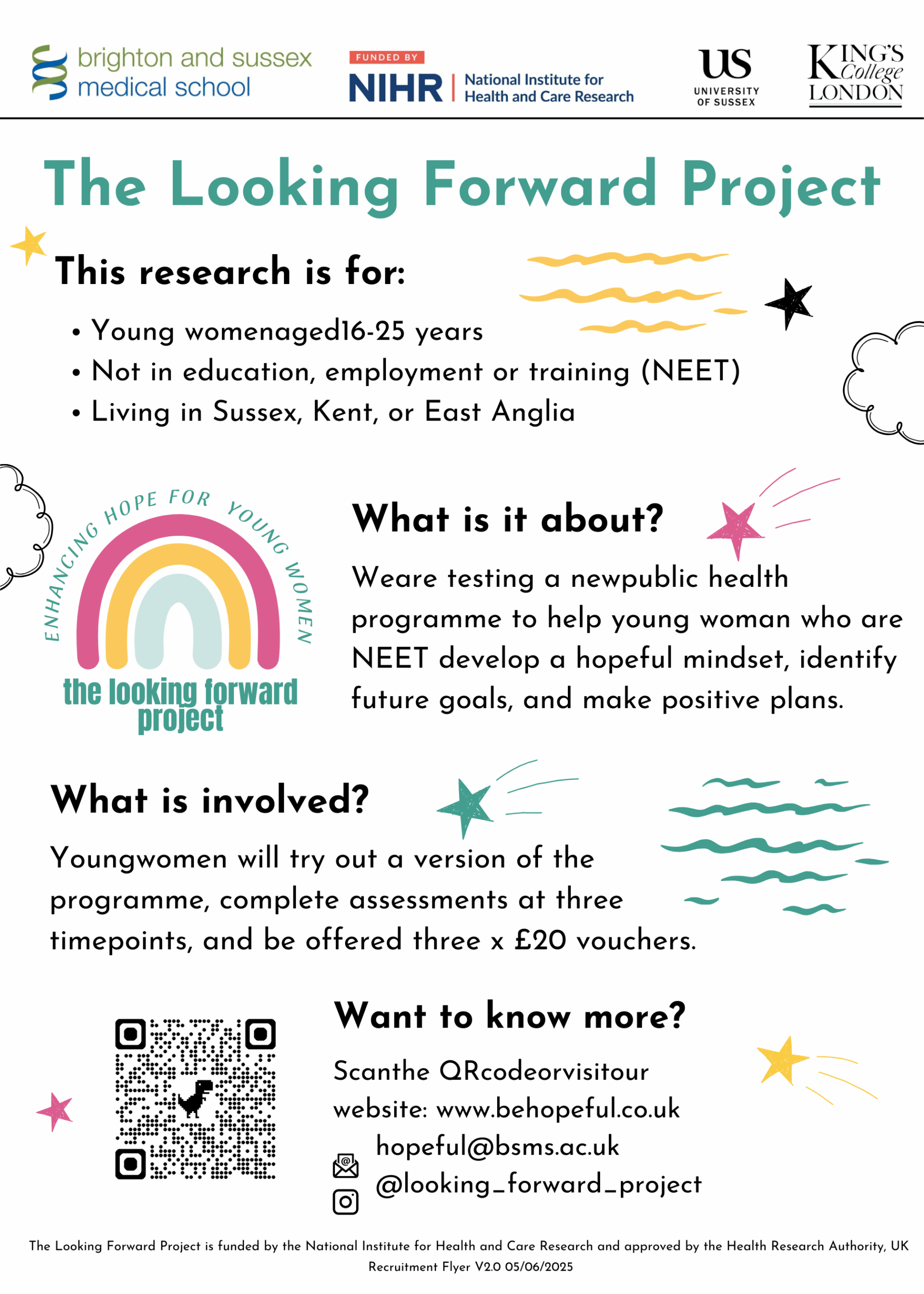 The Looking Forward Project is a research study funded by the National Institute for Health and Care Research. In this project, we are testing a new way to help young women who are not in education, employment, or training called HOPEFUL. The Looking Forward Project is happening in Sussex, Kent, and East Anglia, UK.